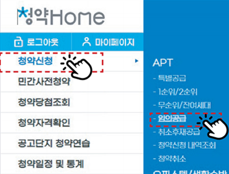 2. 청약신청->APT->임의공급을 클릭합니다.