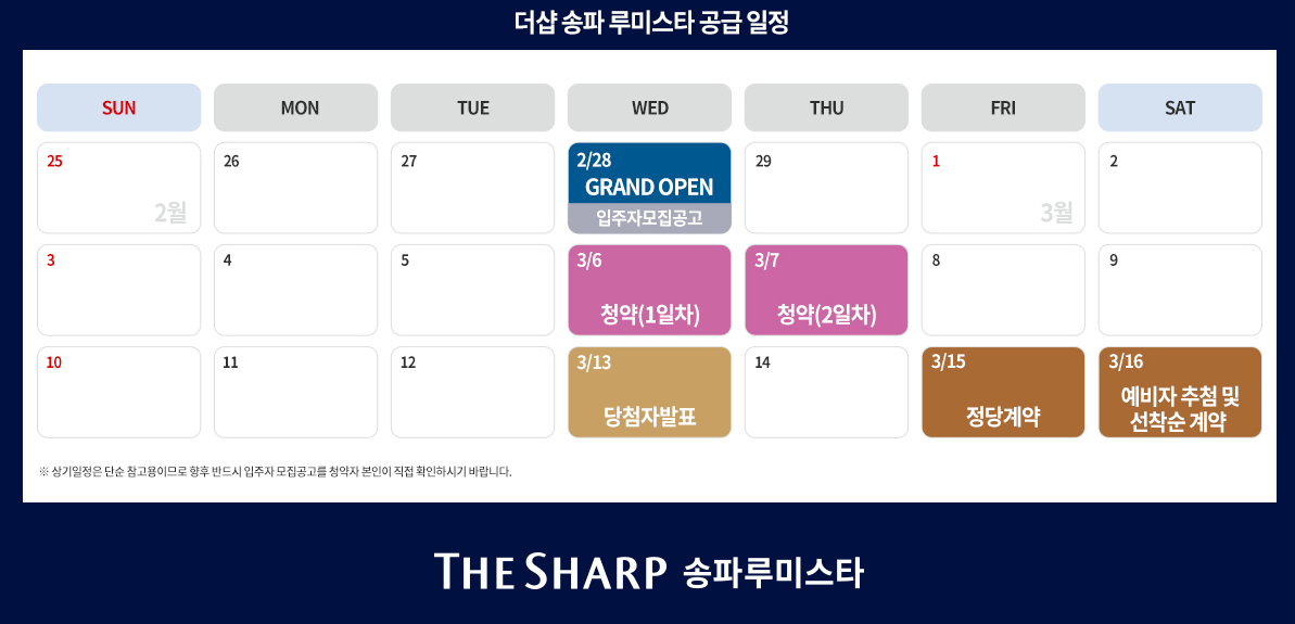 청약 접수일은 이미지 보시는 거와 같이 3월 6일(수요일)에 시작해서 3월 7일(목요일)에 마감합니다. 발표일은 3월 13일(수요일)로 곧바로 결과가 나옵니다. 계약체결 또한 바로 3월 15일에 진행합니다.